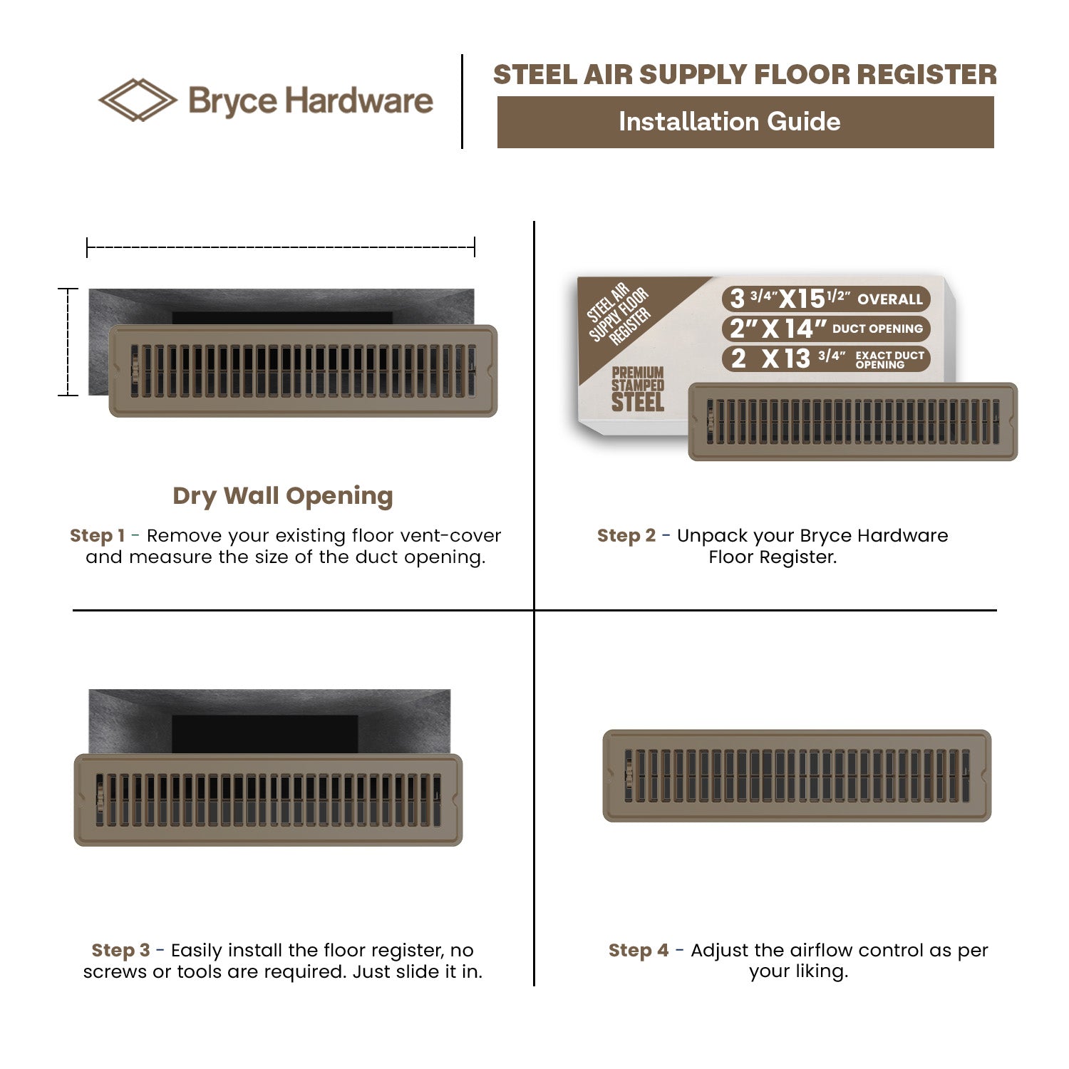 Popular search terms: "2 x 14 floor vent," "steel floor register," "brown HVAC vent cover," "adjustable airflow vent," "modern floor register," "quiet operation vent cover."